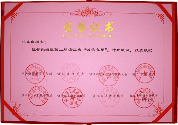 在全市上下认证学习贯彻落实十九大精神之际,由中共镇江市委宣传部、镇江市文明办、镇江市经济和信息化委员会、镇江市信用办、镇江市工商行政管理局、镇江市工商业联合会、镇江市消费者协会、镇江市民营经济协会联合组织开展第二届镇江市“诚信之星”、“诚信标兵”评选活动,我公司董事长杭冬良先生荣获第二届“诚信之星”荣誉称号。