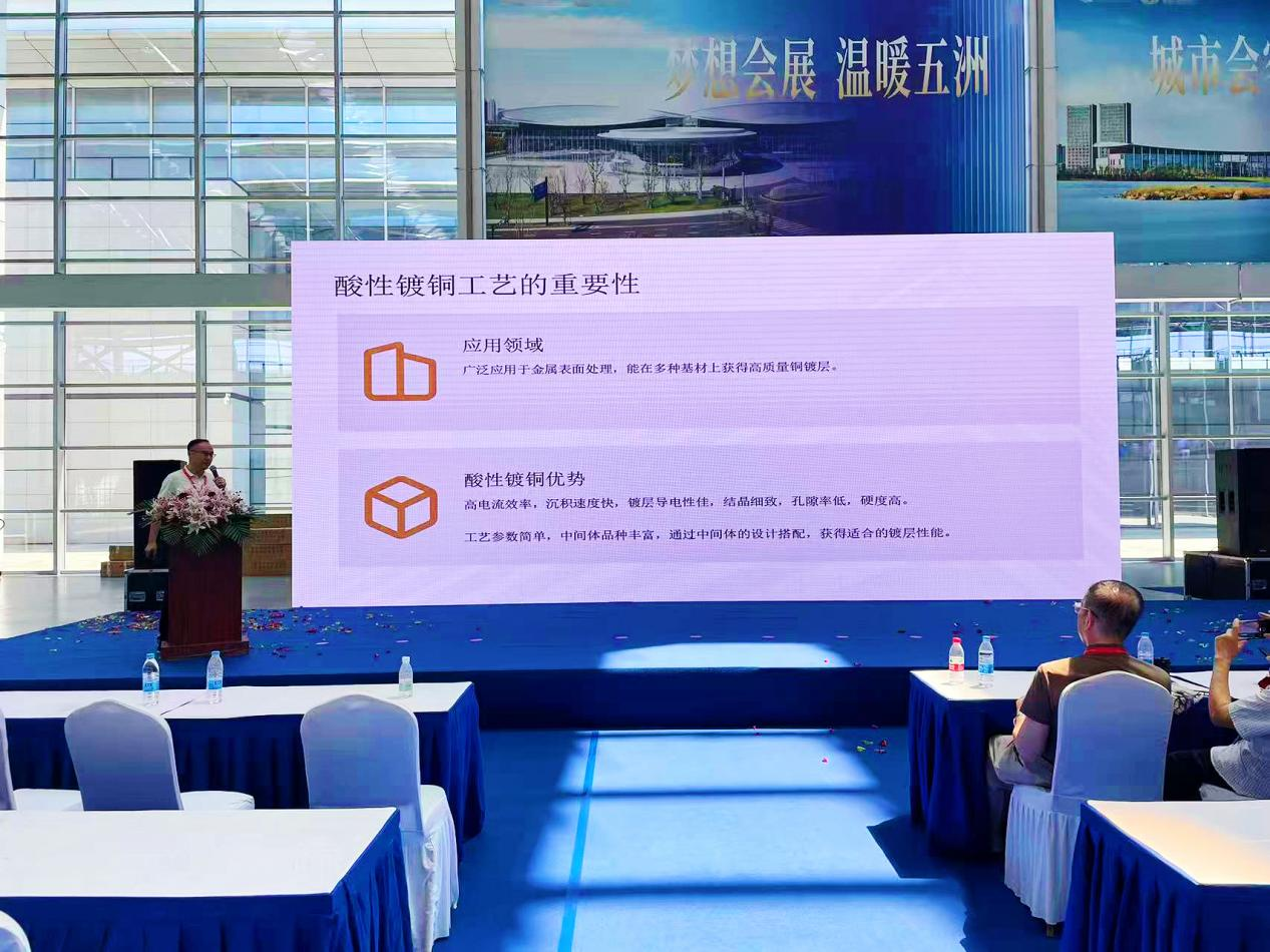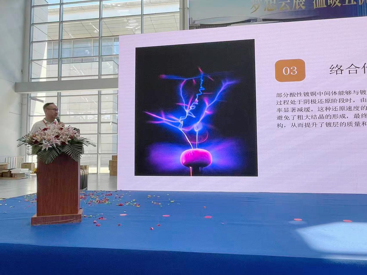 展会期间,江苏梦得应用技术开发部部长方辉明应邀作了题为《酸性镀铜中间体在无染料体系中的应用综述》的学术报告,报告内容围绕酸性镀铜中间体在无染料体系中的技术原理、性能优势及实际应用案例展开,尤其是在当下热门工艺如电解铜箔、PCB盲孔通孔镀等工艺,非染料体系有其独特的性能优势。报告中展示的多组对比实验数据显示,采用公司镀铜中间体的配方方案在力学性能、电流效率及镀层结合力等关键指标上均优于行业平均水平,引发了在场听众的广泛关注和热烈讨论。