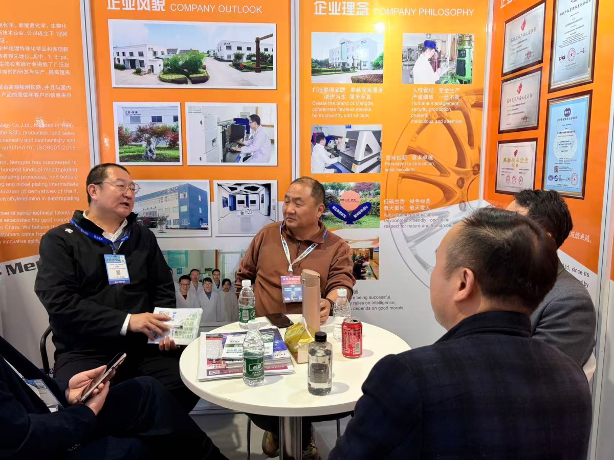 展会现场,江苏梦得展位人气持续高涨,吸引了大批专业观众、行业大咖及合作伙伴驻足洽谈。公司聚焦电镀新材料研发、电镀添加剂生产与销售核心领域,重磅展出多款行业领先的创新产品,其中晶粒细化剂与整平剂结合产物尤为亮眼,凭借突破性技术优势与卓越应用性能,成为现场关注焦点。