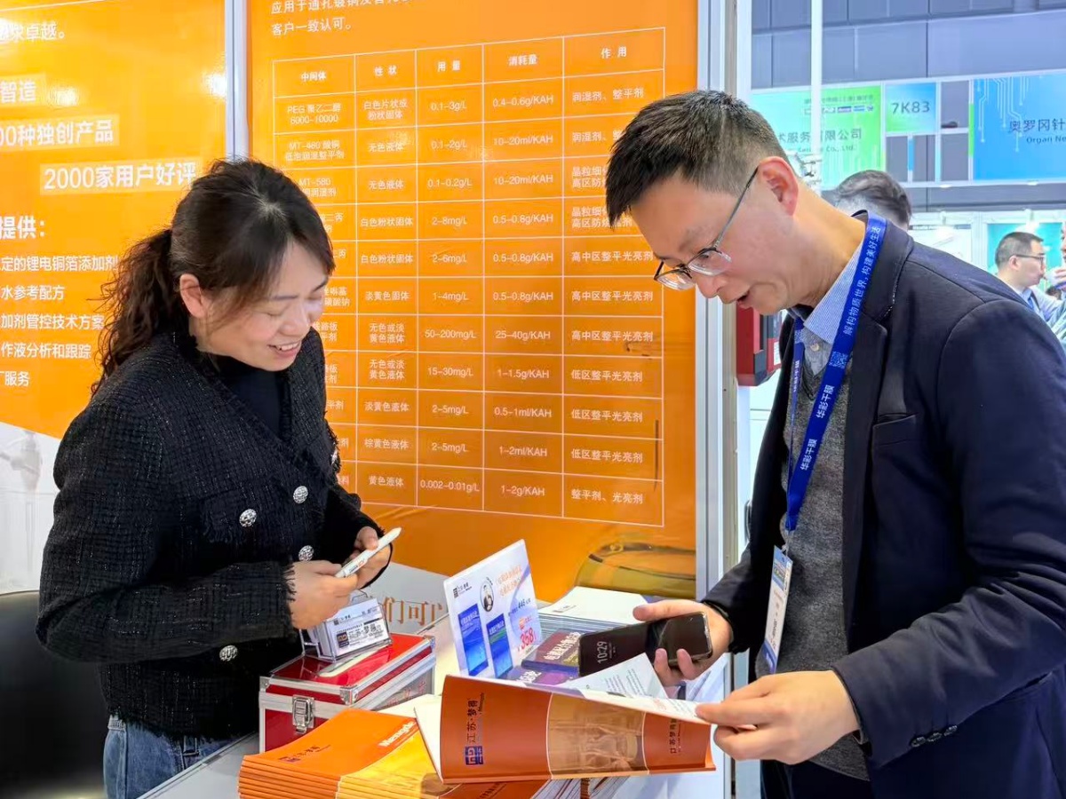 该系列创新产品适配电子电路多元工艺需求,在线路板镀铜工艺中,可有效提升镀液分散性能,精准促进铜优先沉积于铜孔中间,优化镀层成型效果;在电镀硬铜工艺中,能够显著增强镀层硬度,提升产品耐用性与稳定性;在电解铜箔工艺中,作为高抗剂可大幅提高铜箔抗拉强度,助力高端铜箔产品品质升级。每一款产品都凝聚着梦得的研发匠心与技术沉淀,凭借过硬品质与优异性能,收获了现场观众的高度认可与赞誉,众多客商现场深入交流,表达了深度合作、携手开拓市场的强烈意愿。