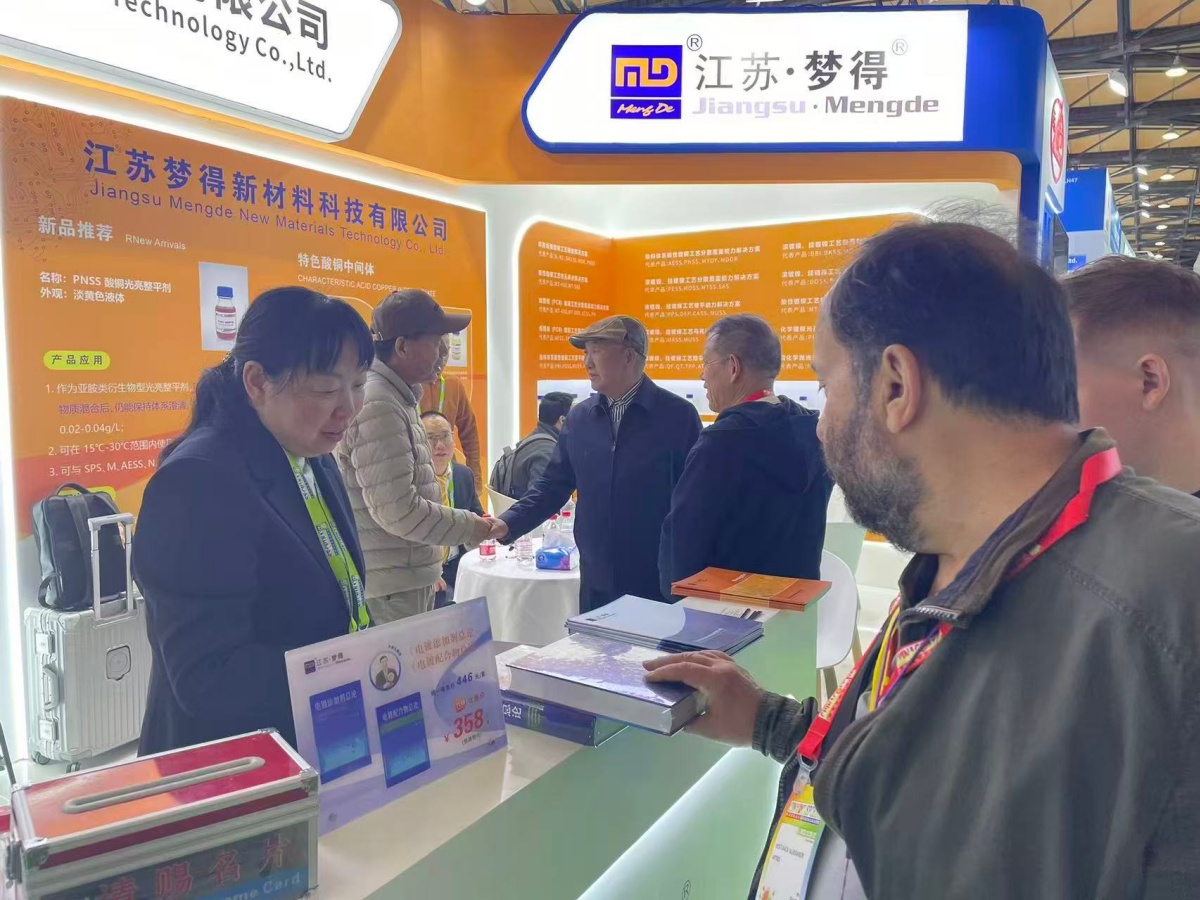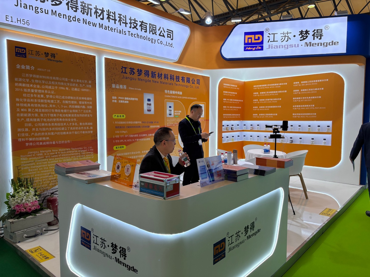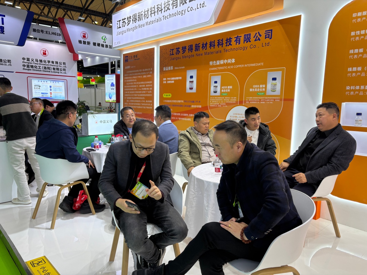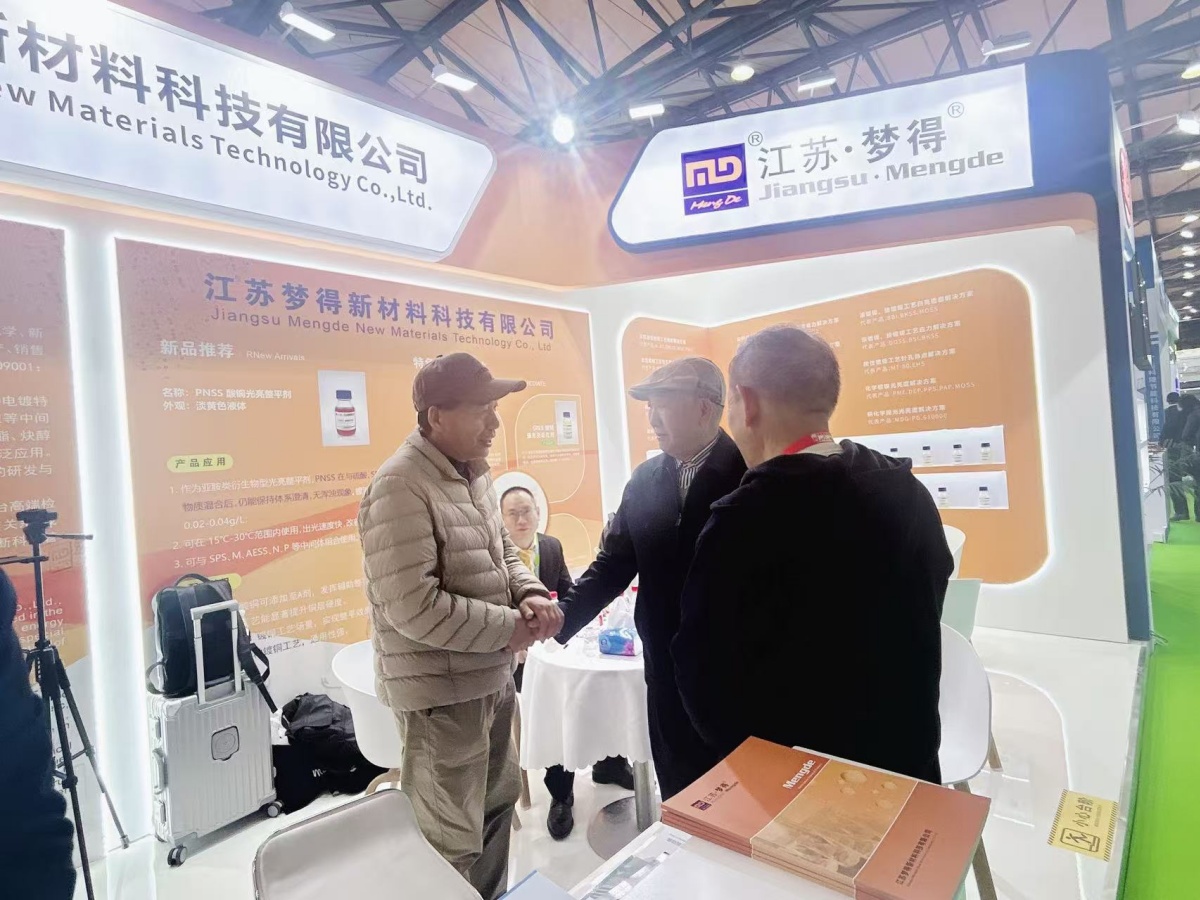 走进E1馆,江苏梦得的展位设计现代而醒目,整体布局科学合理,充分体现了公司“精益求精”的品牌理念。展台上,一系列自主研发的环保型电镀化学品、高性能添加剂、各类型中间体等核心产品整齐陈列,吸引了大批专业访客驻足咨询。我们的技术团队准备了详实的产品资料与生动的应用案例,通过现场演示与讲解,让每一位到访者都能清晰地了解江苏梦得产品如何为客户提升生产效率、优化产品质量、实现绿色制造。