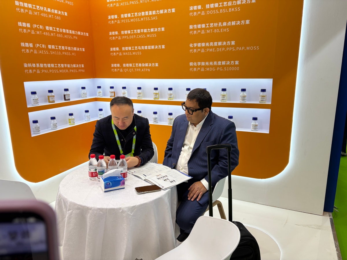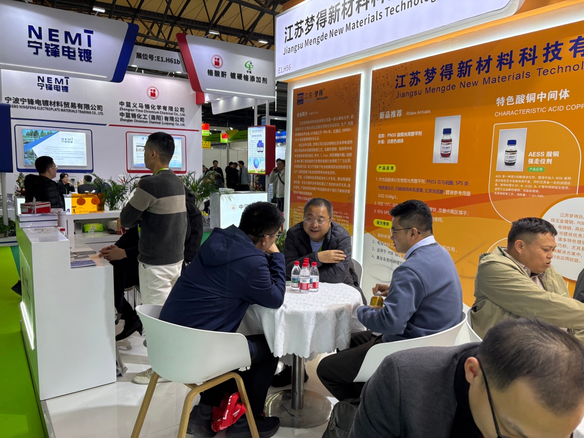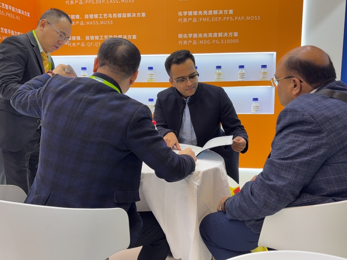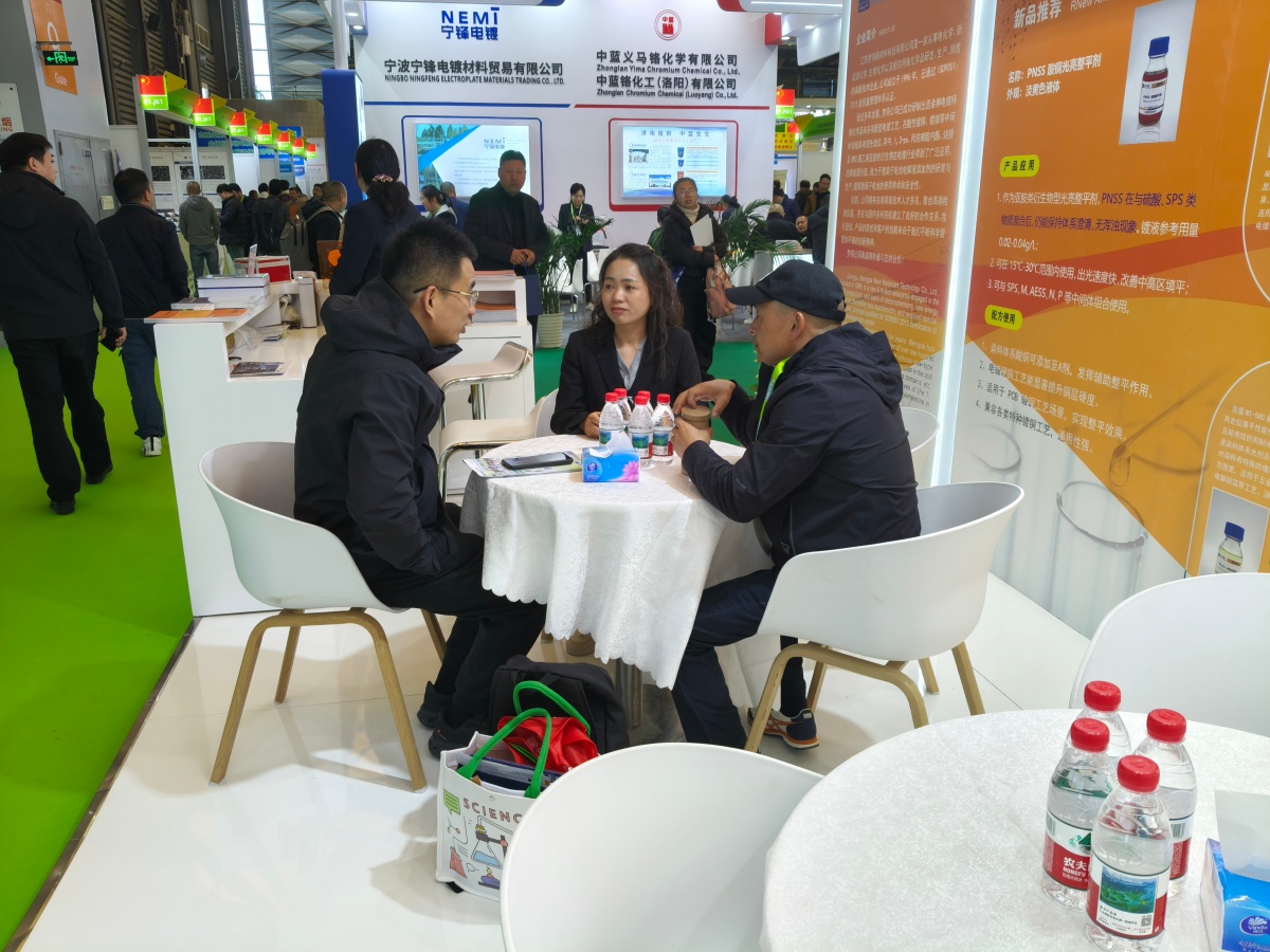 走进E1馆,江苏梦得的展位设计现代而醒目,整体布局科学合理,充分体现了公司“精益求精”的品牌理念。展台上,一系列自主研发的环保型电镀化学品、高性能添加剂、各类型中间体等核心产品整齐陈列,吸引了大批专业访客驻足咨询。我们的技术团队准备了详实的产品资料与生动的应用案例,通过现场演示与讲解,让每一位到访者都能清晰地了解江苏梦得产品如何为客户提升生产效率、优化产品质量、实现绿色制造。